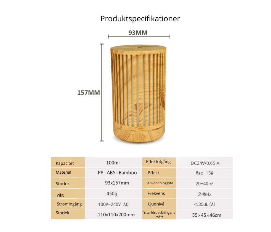 Funktioner: Aromaterapi, luftfuktning, LED-nattlampa